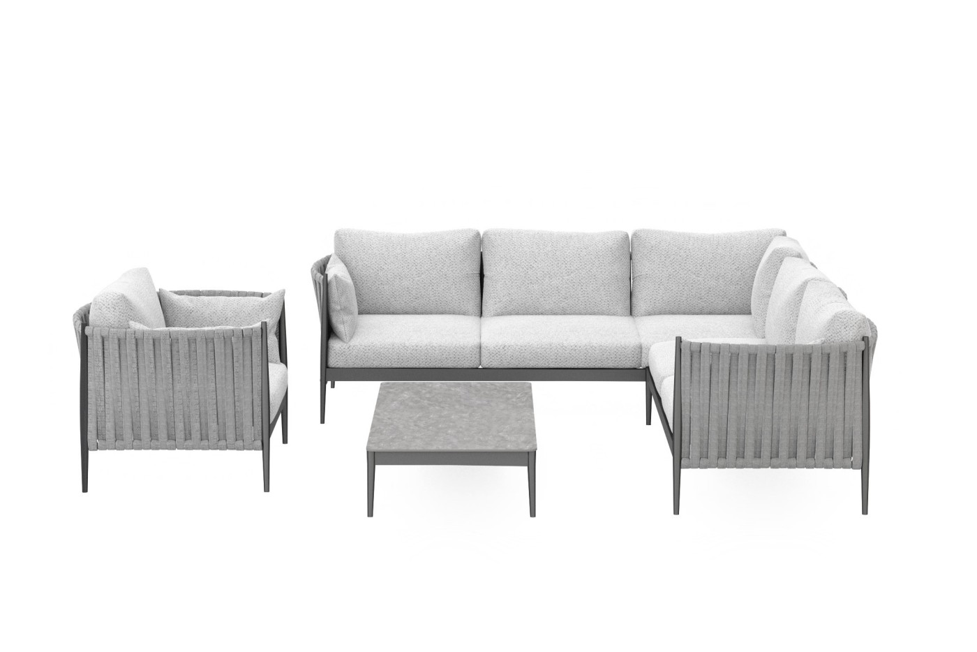 - Elementy zestawu: moduł narożny 2os. prawy, moduł narożny 2os. lewy, moduł narożny pojedynczy, fotel wypoczynkowy, stolik kawowy