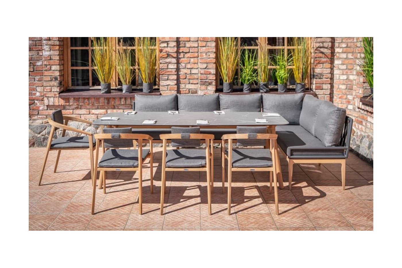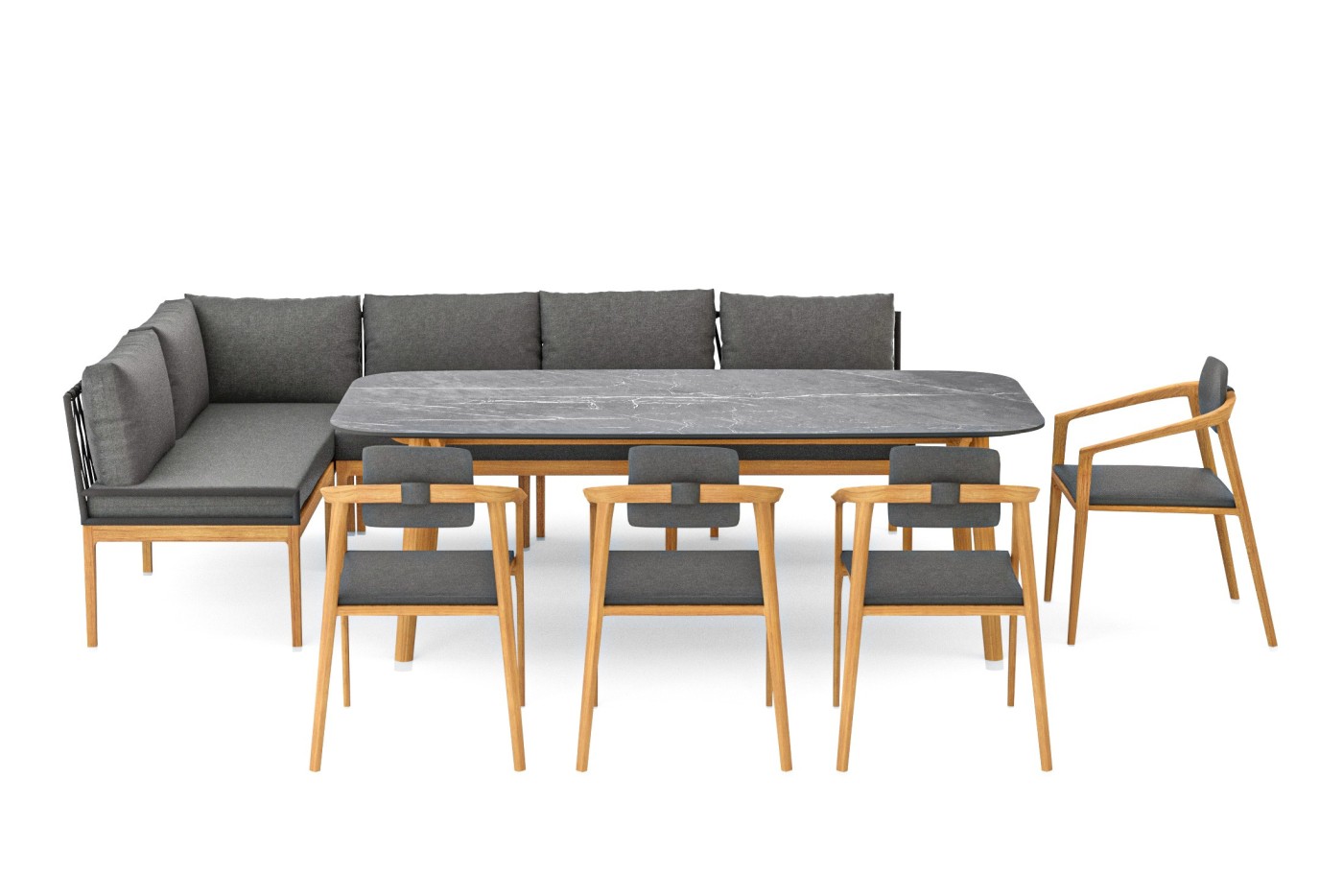 - Elementy zestawu: sofa narożna 2-os., sofa środkowa 3-os., stół obiadowy 220 cm, 3 x krzesło teak mini, krzesło teak